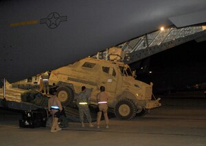 A C-17 Globemaster lll delivers Mine Resistant Ambush Protected Vehicles, or MRAPS, to Bagram Airfield Aug.4. The MRAPS are designed to be both safe and effective for Soldiers conducting patrols, convoy security and other missions throughout Afghanistan. The C-17's mission is to perform tactical