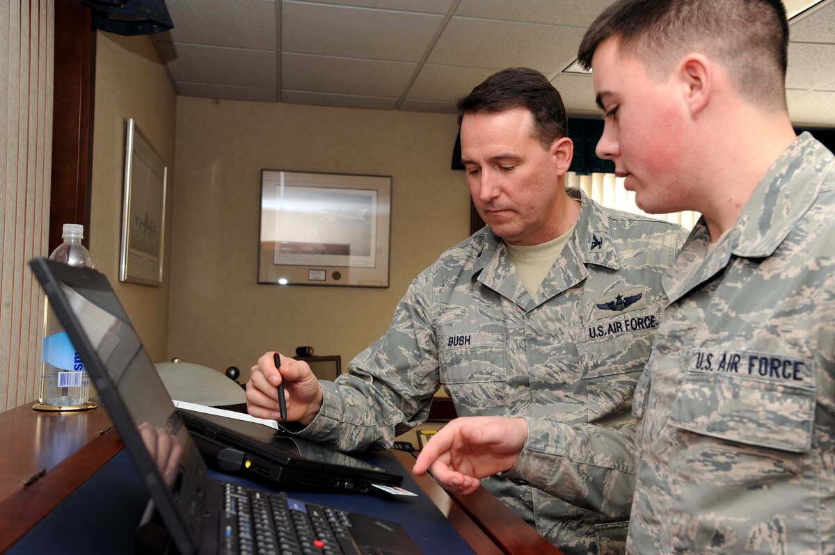 Airman 1st Class Dustin Turner, right, 319th Communications Squadron, trains Col. Timothy Bush, 319th Air Base Wing commander, how to operate his new Lenovo Think Pad X220 business notebook at the wing headquarters building Feb. 27, 2012, on Grand Forks Air Force Base, N.D. The new computer tablet is one of 100 new state-of-art notebooks purchased for the wing's most recent initiative to modernize the technology on base. The 12-inch notebooks weigh less than four pounds and their wireless feature will allow personnel to perform nearly every single task they routinely do using their grounded desktop computers, such as reading and sending e-mails, doing online training and digitally signing documents. (U.S. Air Force Photo/Airman 1st Class Xavier Navarro)