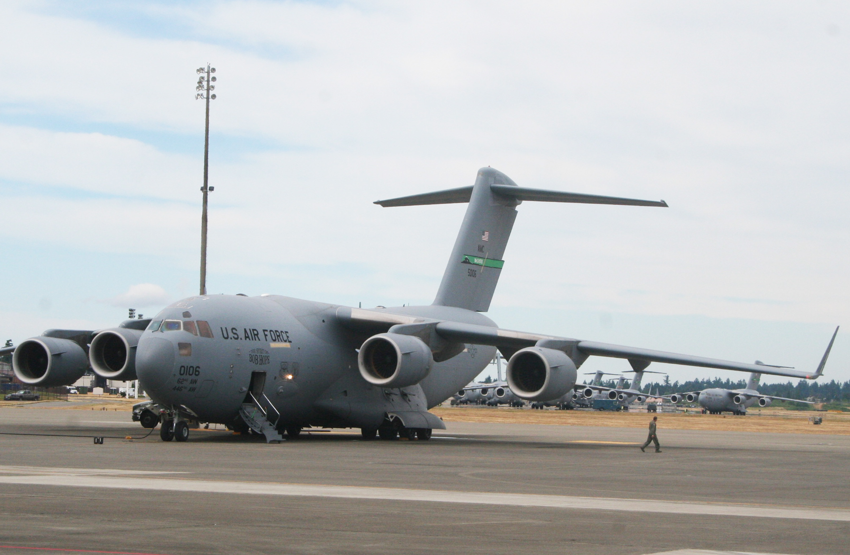 A C-17 Globemaster III from the 62nd Airlift Wing at Joint Base Lewis-McChord, Wash., is parked on the flightline at the base on July 18, 2011. The C-17 is one of the aircraft that will be used for Air Mobility Rodeo 2011. Rodeo, sponsored by the Air Mobility Command, is the Mobility Air Force's (MAF) readiness competition. This competition focuses on improving our worldwide air mobility forces' professional core abilities. Air Mobility 2011 will be held at McChord Field, Wash., July 24-29, 2011. More than 150 teams and 3,000 people from the Air Force, and Air Force Reserve, as well as allied nations, are expected to participate. (U.S. Air Force Photo/Master Sgt. Scott T. Sturkol)