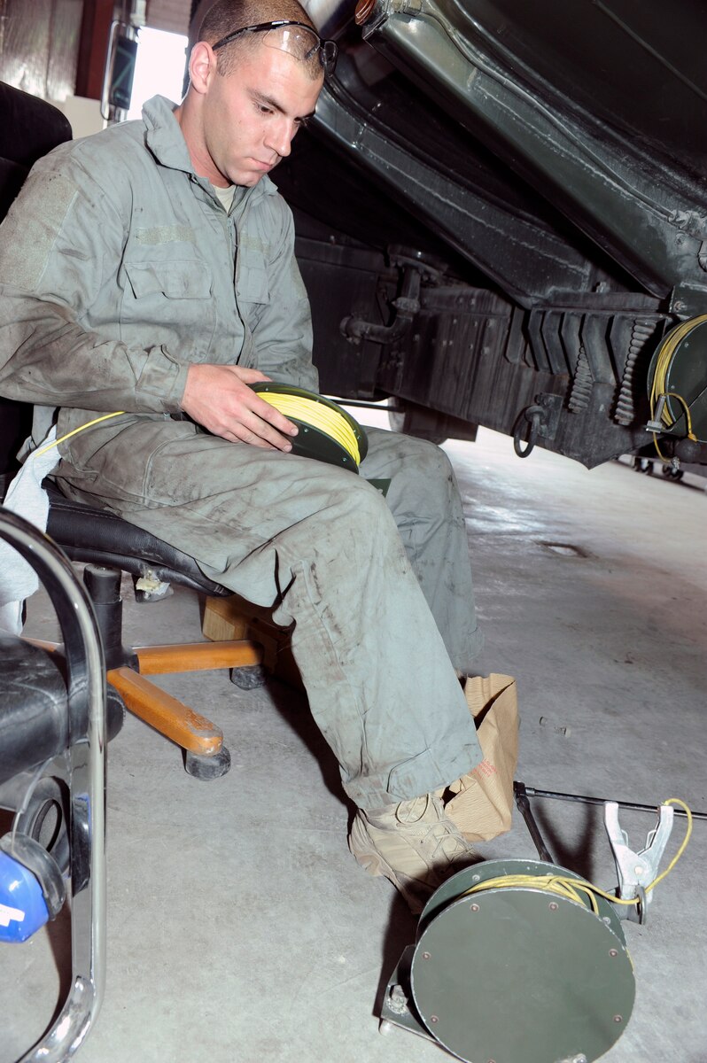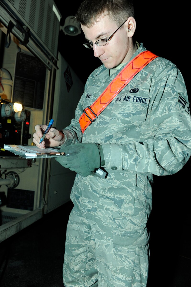 Airman 1st Class Jacob Baxendale, 376th Expeditionary Logistics Readiness Squadron, makes a refueling run at the Transit Center at Manas, Kyrgyzstan, on April 7, 2011. Airman Baxendale, deployed from the 22nd Logistics Readiness Squadron at McConnell Air Force Base, Kan., helped achieve a squadron record of pumping 587,546 gallons of jet fuel in a 24-hour period on March 11, 2011. Previously, the 51-person and four Kyrgyz personnel-held record was set Feb. 18, 2011, at 544,758 gallons in 24 hours. (U.S. Air Force Photo/Tech. Sgt. Jerome C. Baysmore)