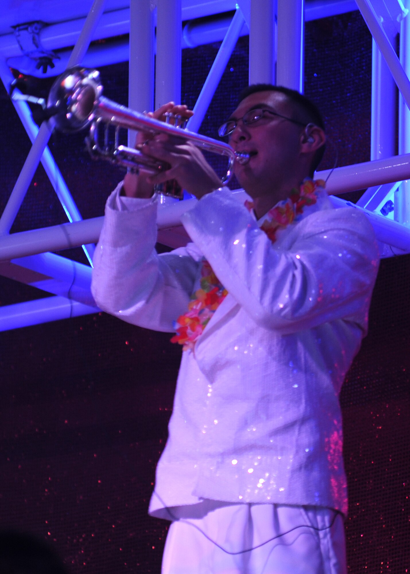 First Lt. Joshua Frilling, 319th Logistics Readiness Squadron, plays the trumpet during a performance with Tops in Blue on Dec. 7, 2009, at the Charles Fritz Auditorium in Grand Forks, N.D. Lieutenant Frilling is on permissive temporary-duty assignment, while performing with Tops in Blue. Tops in Blue is an all-active duty U.S. Air Force special unit made up of amateur performers selected for their entertainment abilities. (U.S. Air Force Photo/Staff Sgt. Suellyn F. Nuckolls)