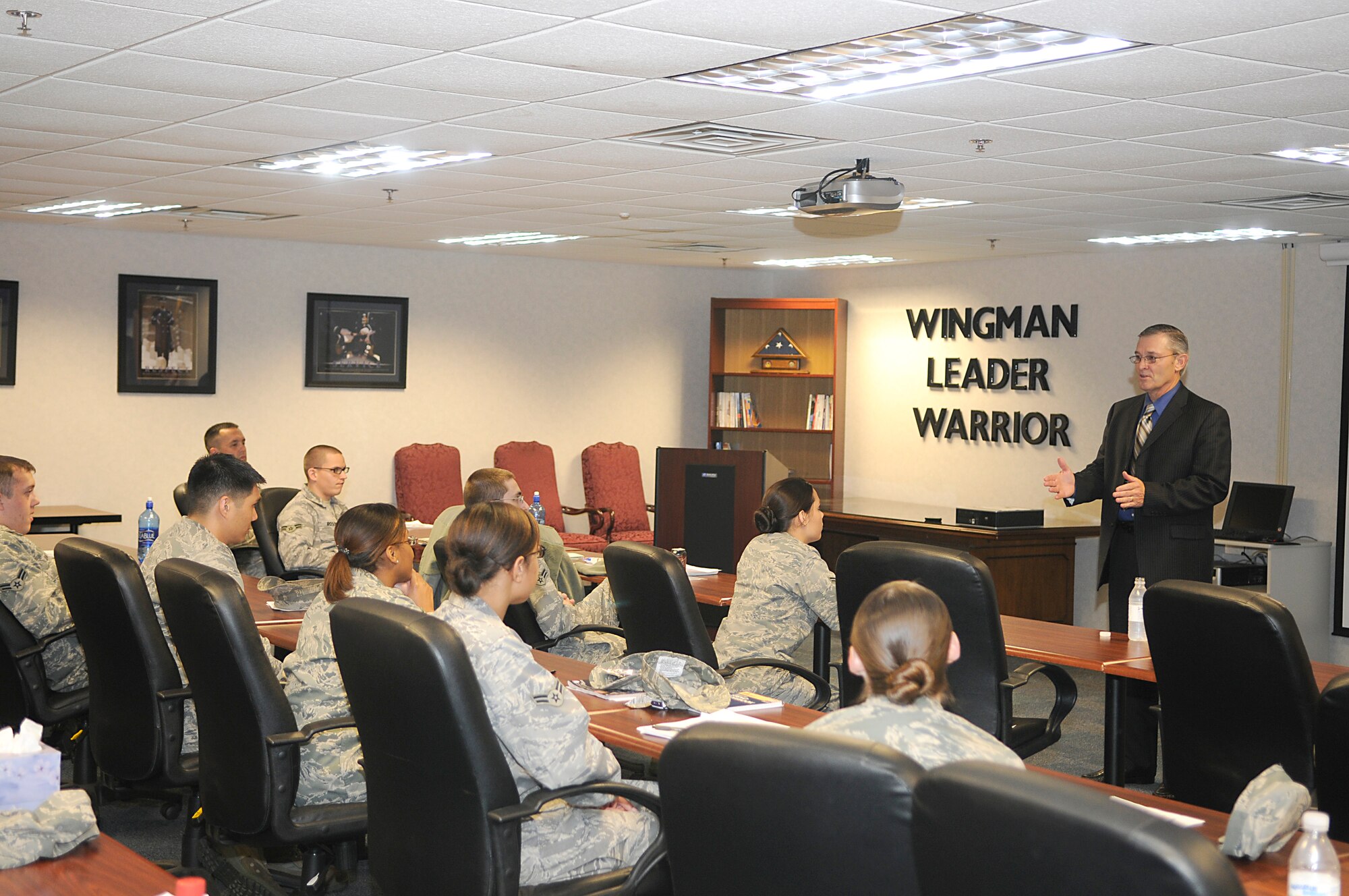 Retired Chief Master Sgt. Joe Markin talks to Airmen during a Professional Enhancement Course on Oct. 23, 2009, at Scott Air Force Base, Ill. Airmen from different Air Force specialties came together to attend the quarterly Airmen Enhancement Program designed to revisit instruction they received early in their careers, and receive mentorship and insight from senior leaders. (U.S. Air Force Photo/Senior Airman Brian Ellis)