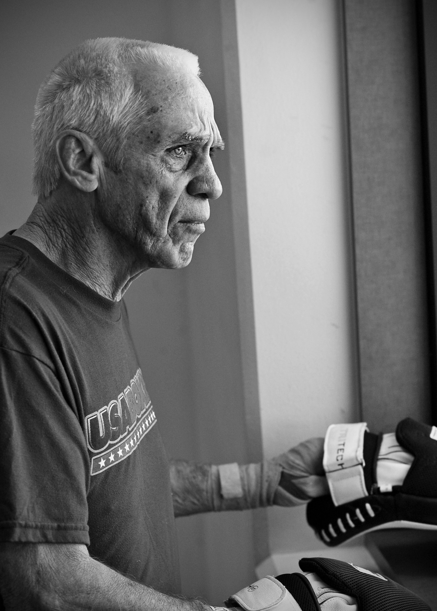 Danny Graves watches on as Jessica Toreno practices her boxing technique on the speed bag at the base gym at Fairchild Air Force Base, Wash., Sept. 19, 2013. Graves runs the boxing clinic for amateur boxers and beginners at the fitness center on base. (U.S. Air Force photo/Senior Airman Taylor Curry)