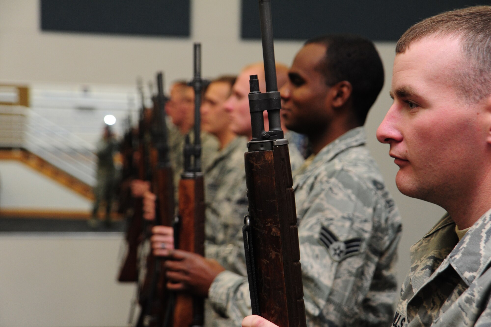 Airman 1st Class Carmella Kraus, Fairchild Air Force Base, Wash., Honor Guard, poses at the position of port arms Oct. 28, 2011. The position of port arms is achieved by placing the top of the rifle at the left eye and the stock at your right eye. (U.S. Air Force photo/Airman 1st Class Taylor Curry)