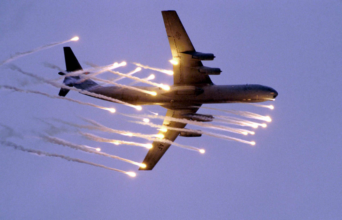 FILE PHOTO -- A C-141B Starlifter from McGuire Air Force Base, N.J., launches flares on its final pass over the "danger zone." The training exercise allowed loadmasters to use a new Plexiglas bubble to look for surface-to-air missile plumes and allowed aircrew members to practice evasive maneuvers. (U.S. Air Force photo by Gary Ell)