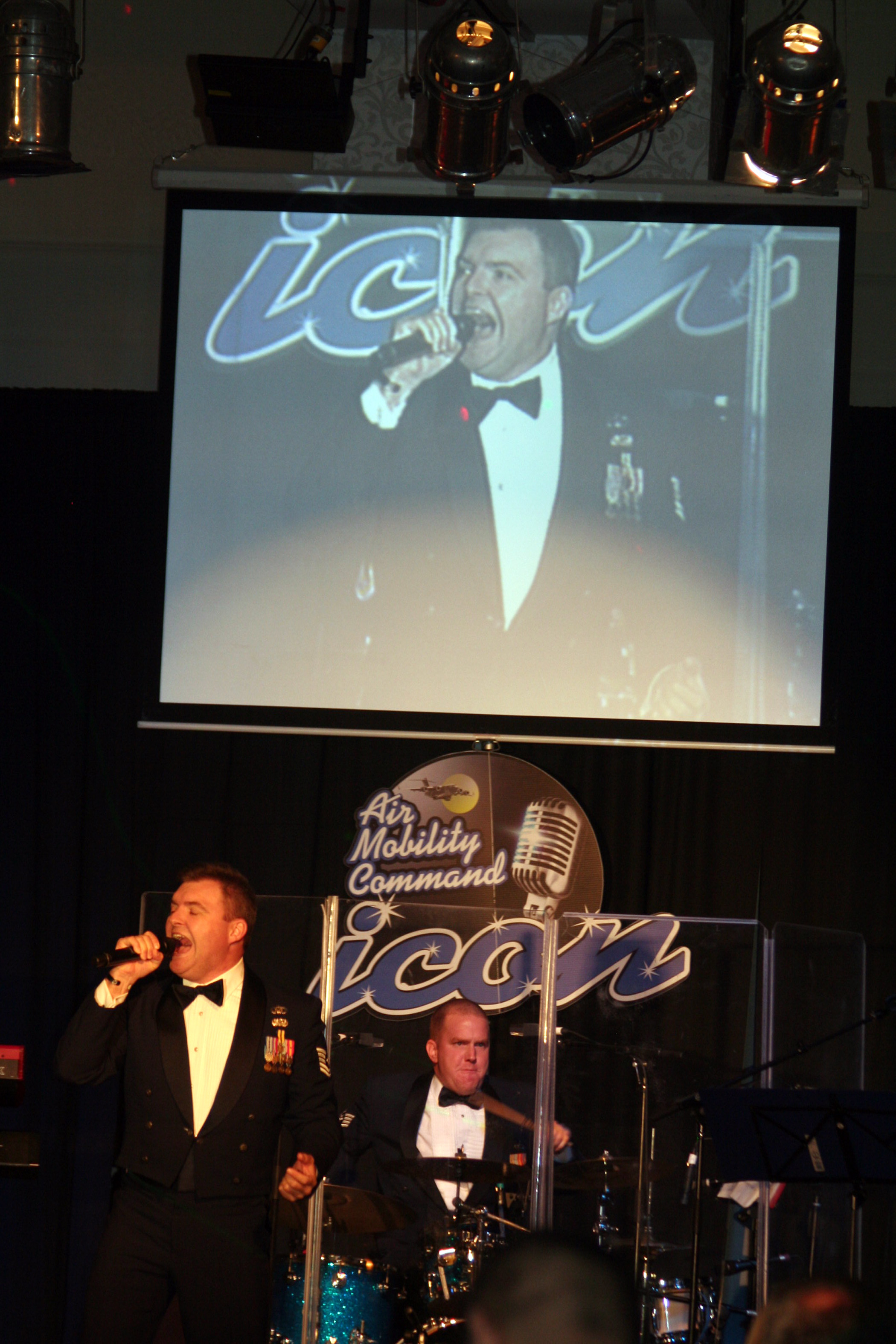 Tech. Sgt. Jamie Gilley, vocalist for the Starlifter band from the U.S. Air Force Band of Mid-America, sings during the 2011 Air Mobility Command Icon finals Oct. 20, 2011, at Scott Air Force Base, Ill. The Starlifter band played all of the music for the 10 competitors in the Icon competition. (U.S. Air Force Photo/Master Sgt. Scott T. Sturkol)