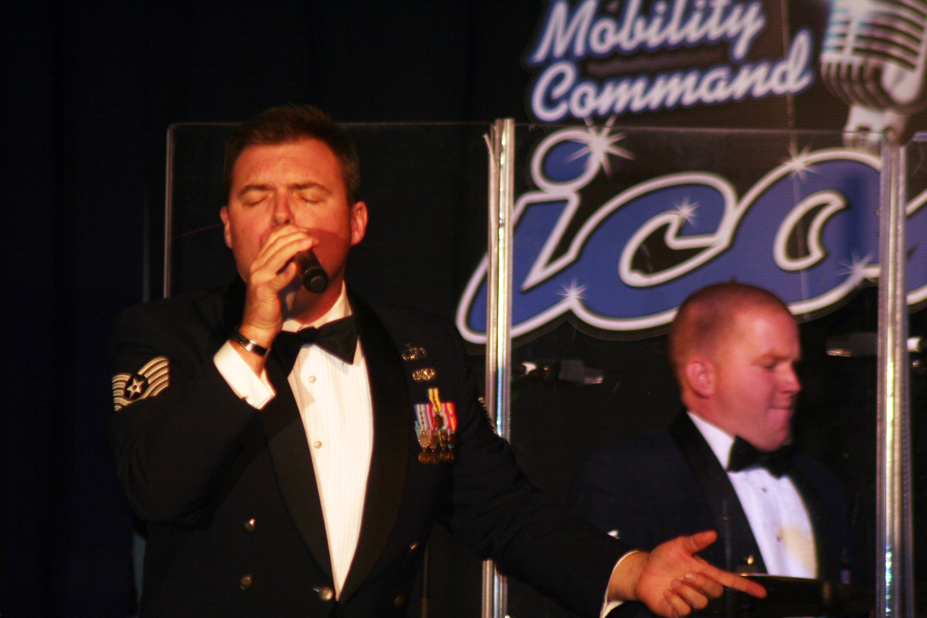 Tech. Sgt. Jamie Gilley, vocalist for the Starlifter band from the U.S. Air Force Band of Mid-America, sings during the 2011 Air Mobility Command Icon finals Oct. 20, 2011, at Scott Air Force Base, Ill. The Starlifter band played all of the music for the 10 competitors in the Icon competition. (U.S. Air Force Photo/Master Sgt. Scott T. Sturkol)