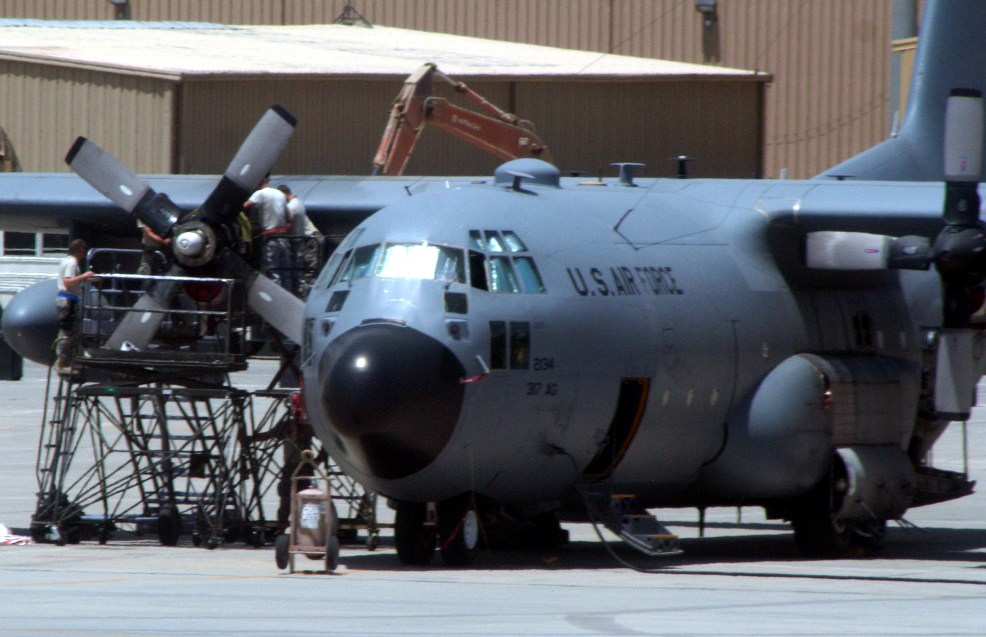 Aircraft maintenance Airmen work on C-130 Hercules aircraft deployed with the 774th Expeditionary Airlift Squadron on the flightline at Bagram Airfield, Afghanistan, on June 6, 2011. The 774th EAS is part of the 455th Air Expeditionary Wing at Bagram Airfield. (U.S. Air Force Photo/Master Sgt. Scott T. Sturkol)
