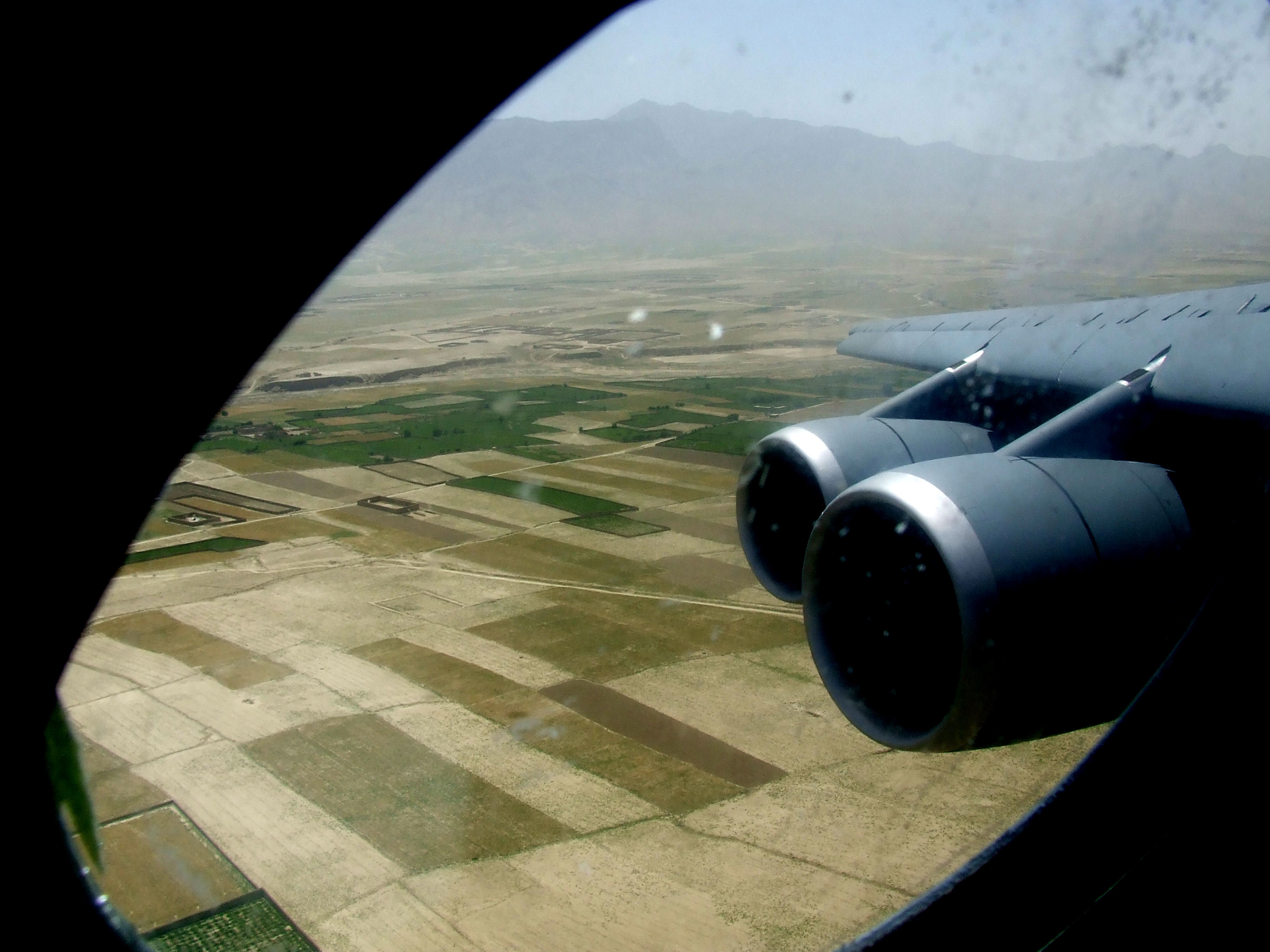 The countryside of Afghanistan can be seen through the window of a C-5M Super Galaxy during an airlift mission on June 6, 2011. The C-5M was on the first direct delivery airlift mission that went through the Arctic Circle from Dover Air Force Base, Del., to Bagram Airfield, Afghanistan, between June 5-6, 2011. (U.S. Air Force Photo/Master Sgt. Scott T. Sturkol)