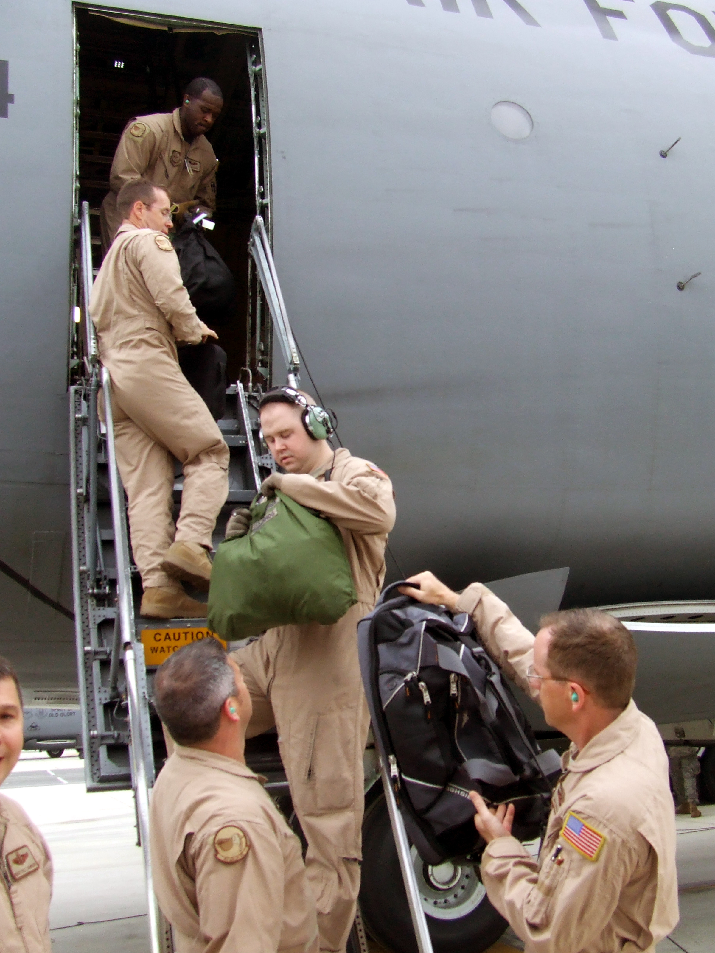 Active duty and Air Force Reserve aircrew Airmen prepare to board a C-5M Super Galaxy on June 5, 2011, prior to the plane's departure for a direct delivery airlift mission through the Arctic Circle from Dover Air Force Base, Del., to Bagram Airfield, Afghanistan. The Airmen were from the 9th Airlift Squadron, 709th Airlift Squadron and the 436th Aircraft Maintenance Squadron at Dover AFB. (U.S. Air Force Photo/Master Sgt. Scott T. Sturkol)