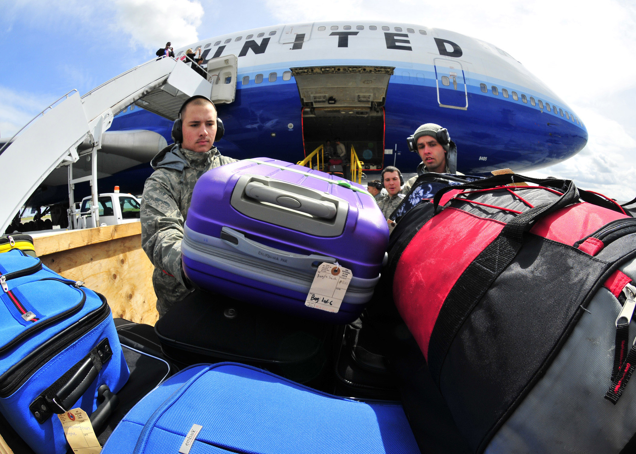 Air Force personnel remove luggage from an aircraft carrying Air Force and Navy families returning from Japan during Operation Pacific Passage operations on March 25, 2011, at Travis Air Force Base, Calif. Operation Pacific Passage gives military families the opportunity to voluntarily relocate from Japan to a safe haven in the U.S. in order to conserve Japanese resources. (U.S. Navy Photo/Mass Communication Specialist 2nd Class Eddie Harrison)