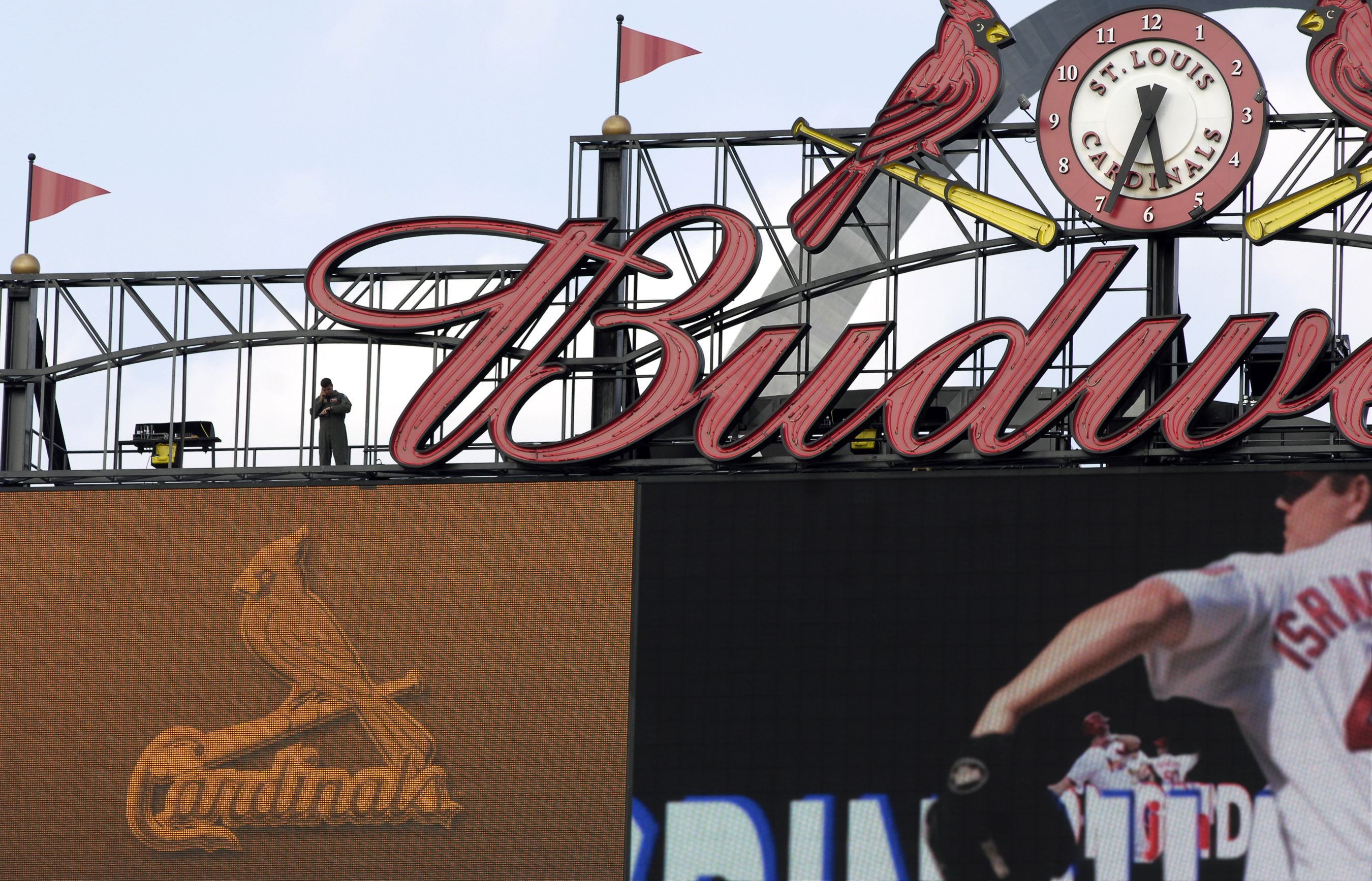 High atop the St Louis Cardinals scoreboard, Capt. Dan Simpson calls in a C-17 Globemaster III as the National Anthem comes to an end before a Cardinals-Giants baseball game July 7. The flyover was part of Air Force Week St. Louis. (U.S. Air Force photo/Staff Sgt. Brian Ferguson)