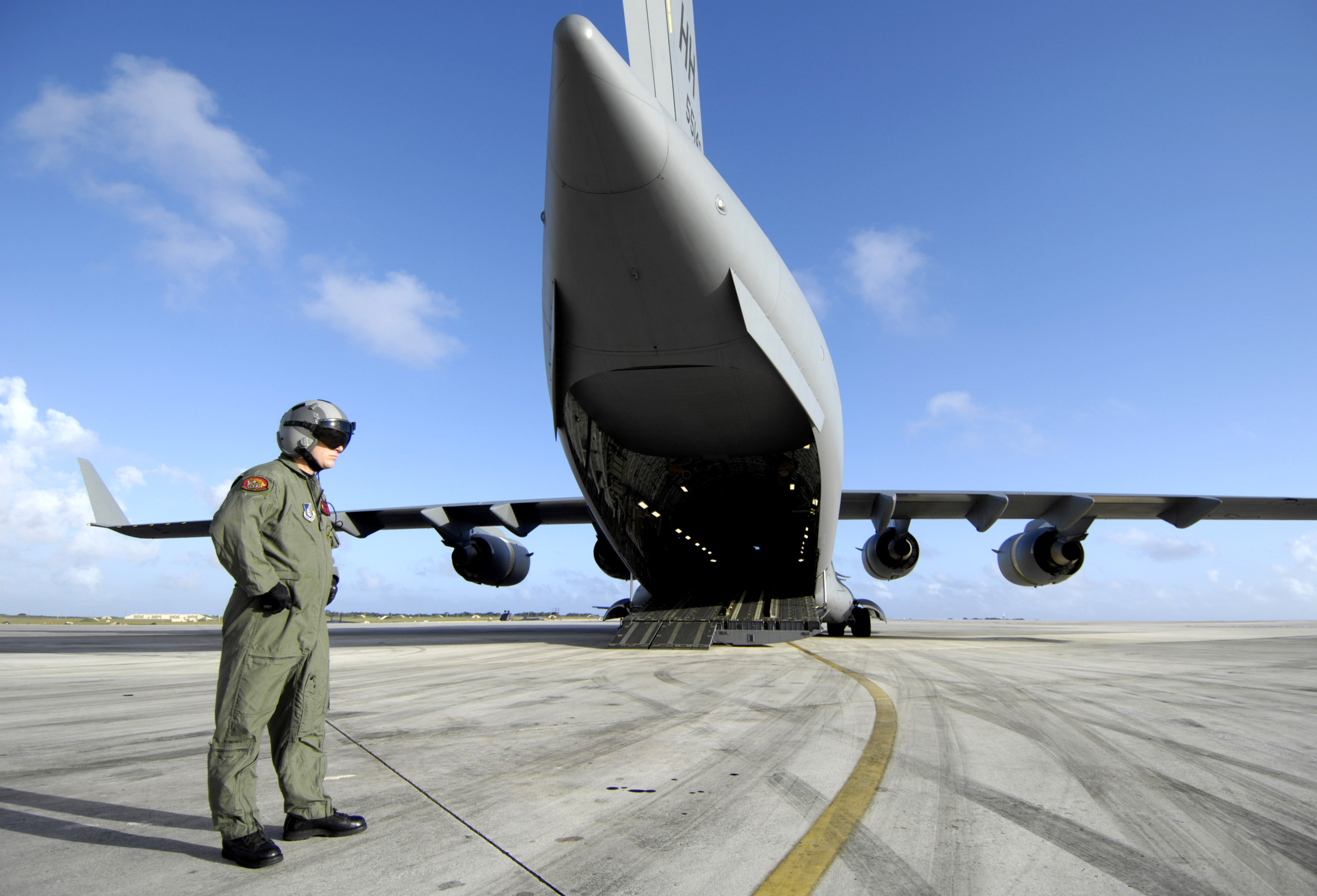 Staff Sgt. Allen Culbreth waits for his C-17 Globemaster III to launch on an upcoming airdrop mission Dec. 14 at Andersen Air Force Base, Guam. The C-17 from Hickam Air Force Base, Hawaii, is conducting airdrop training at Andersen AFB. Sergeant Culbreth is a loadmaster with the 535th Airlift Squadron. (U.S. Air Force photo/Tech. Sgt. Shane A. Cuomo)
