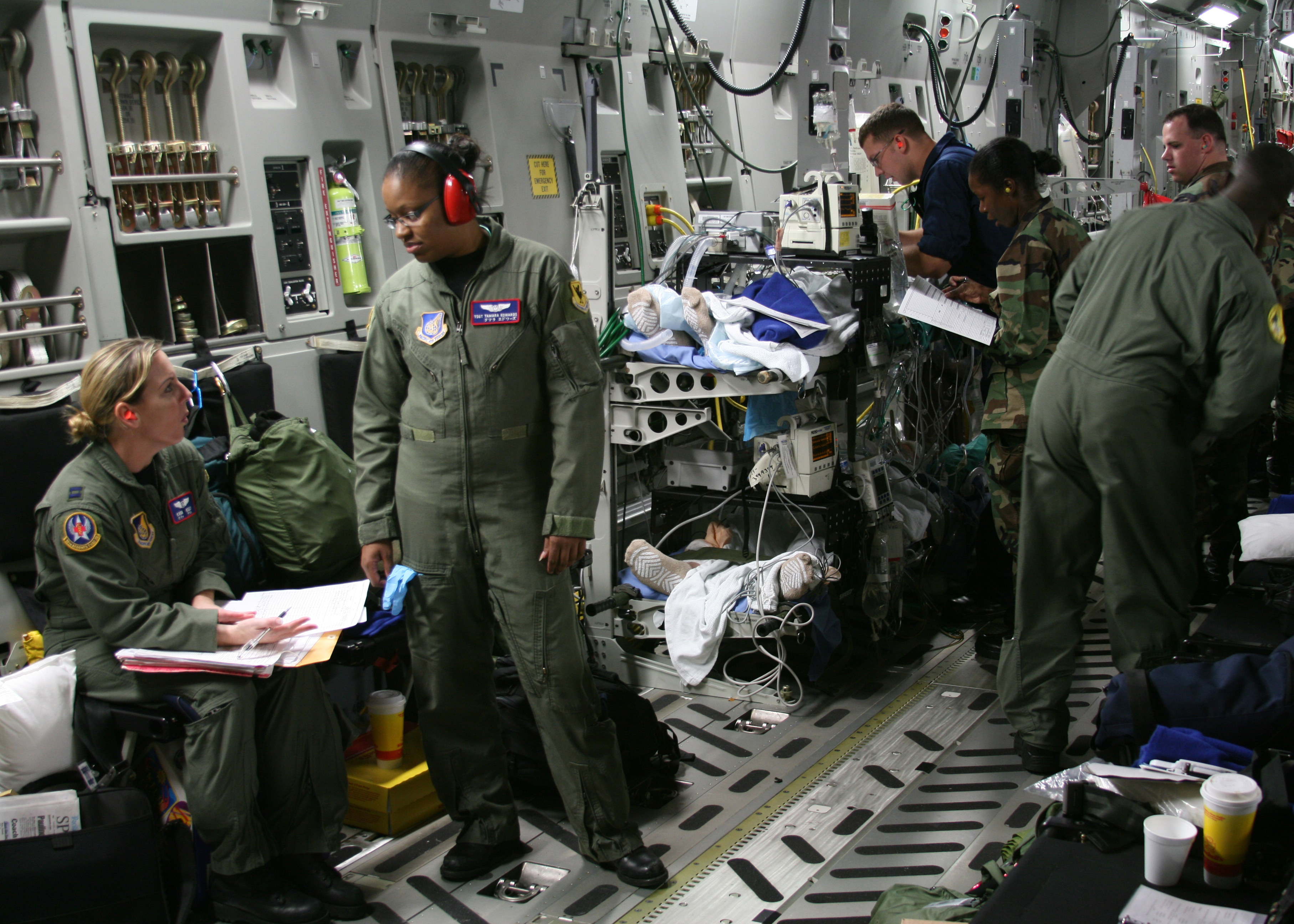 Crewmembers attend to patients aboard a C-17 Globemaster III at Hickam Air Force Base, Hawaii. Six sailors from the USS Frank Cable were injured when a steamline burst while the sailors were conducting routine maintenance. (U.S. Air Force photo/Air Force Master Sgt. Roderick Reyes)