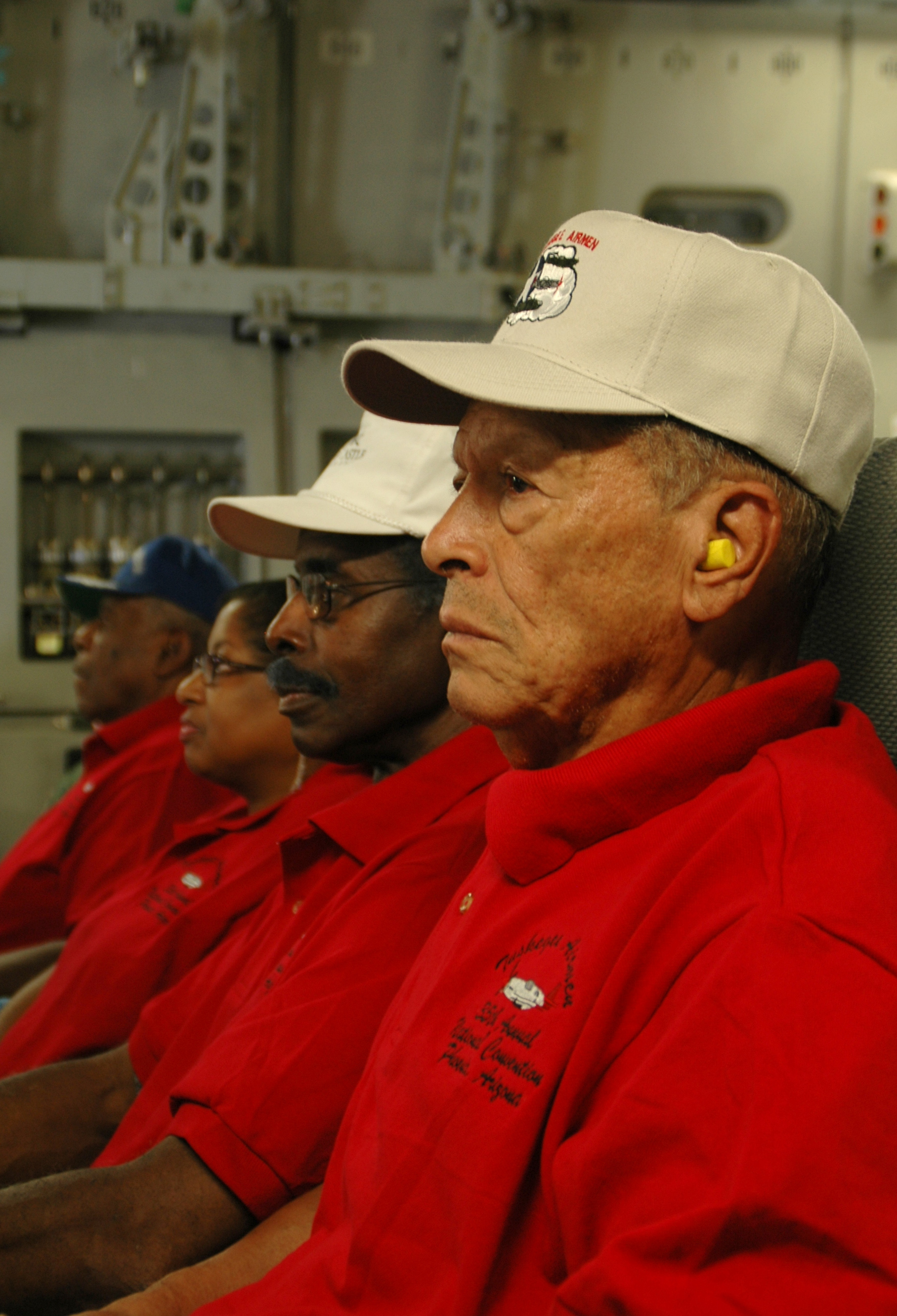 Donald Jackson (right), along with other original Tuskegee Airmen wait for the take-off of a C-17 Globemaster III for an orientation flight. The original Tuskegee Airmen were given the orientation flight by an all African American crew as part of the 2006 Tuskegee Airman Convention held in Phoenix, Ariz. (Photo by Capt. Wayne Capps, USAFR)