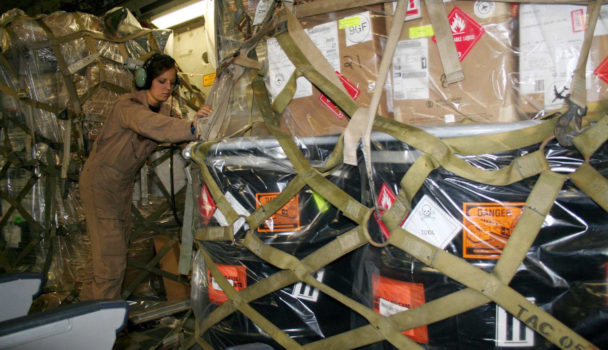 Airman 1st Class Suzanne Van Elk gets a pallet rolling for download from a C-17 Globemaster III at Manas Air Base, Kyrgyzstan. When cargo includes hazardous material, like the volatile methanol on this pallet, loadmasters plan the cargo load around it, keeping incompatible cargo away. Airman Van Elk is deployed from McChord Air Force Base, Wash. (U.S. Air Force photo)