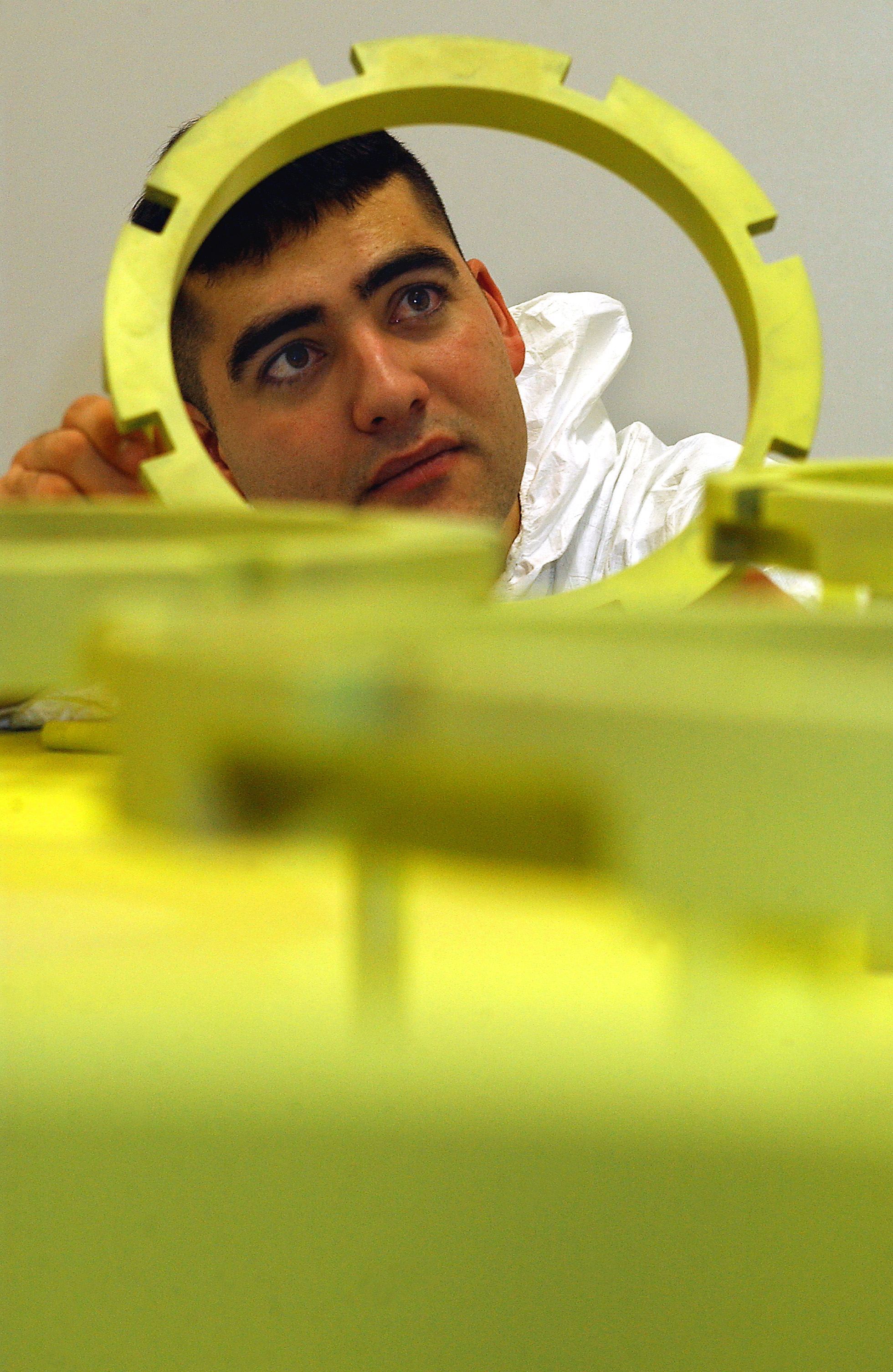 ROYAL AIR FORCE MILDENHALL, England -- Staff Sgt. Corey Wright inspects KC-135 Stratotanker brake rings to ensure an even coat of paint has been applied. Sergeant Wright is an aircraft structural maintainer on temporary duty here from Fairchild Air Force Base, Wash. (U.S. Air Force photo by Airman 1st Class Franklin J. Perkins)
