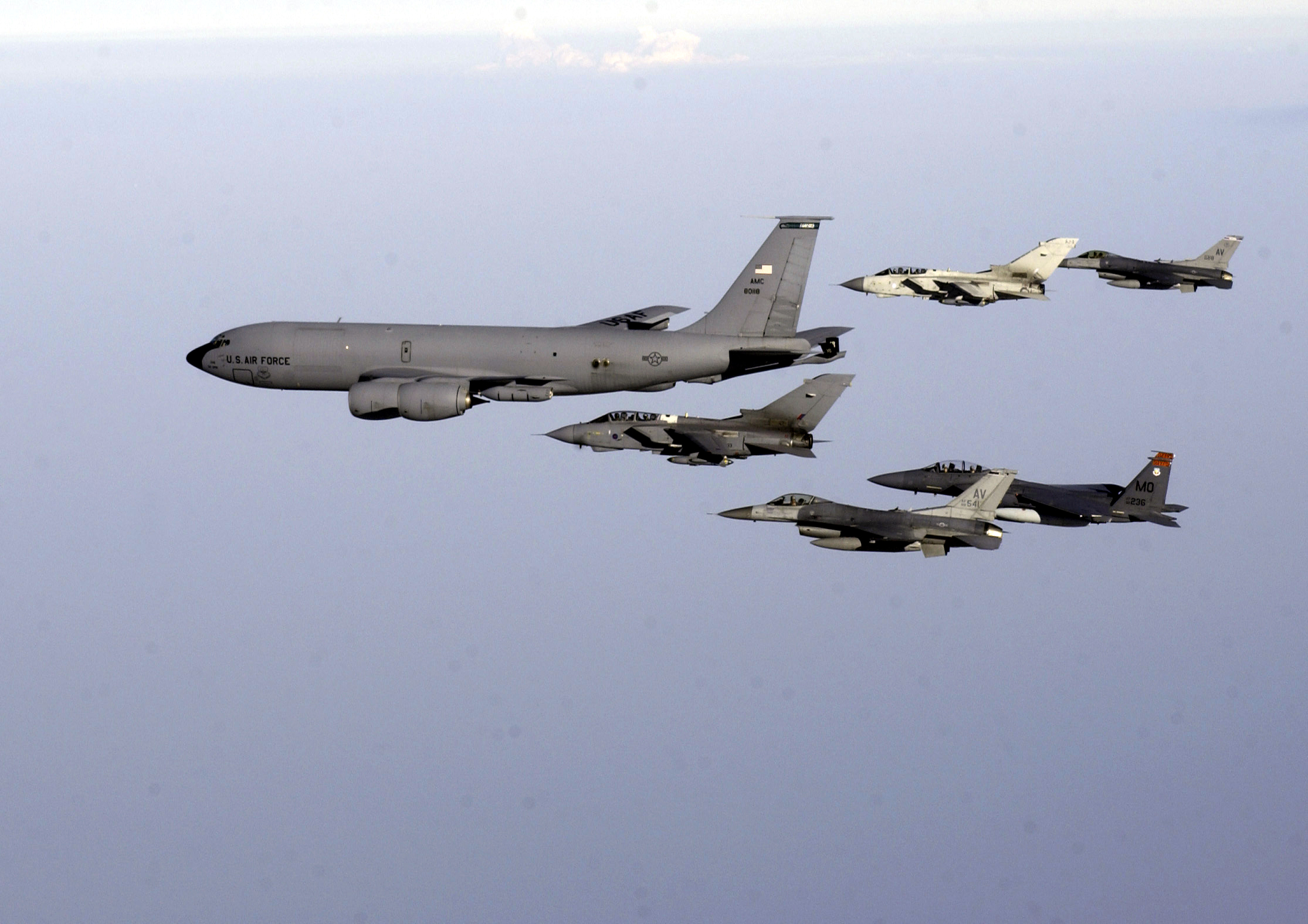 OVER SOUTHWEST ASIA -- A KC-135 Stratotanker leads a formation of an F-15 Strike Eagle, two F-16 Fighting Falcons and two British GR4 Tornados on Dec. 29. The aircraft and crews are supporting operations here. (U.S. Air Force photo by Staff Sgt. Suzanne M. Jenkins)