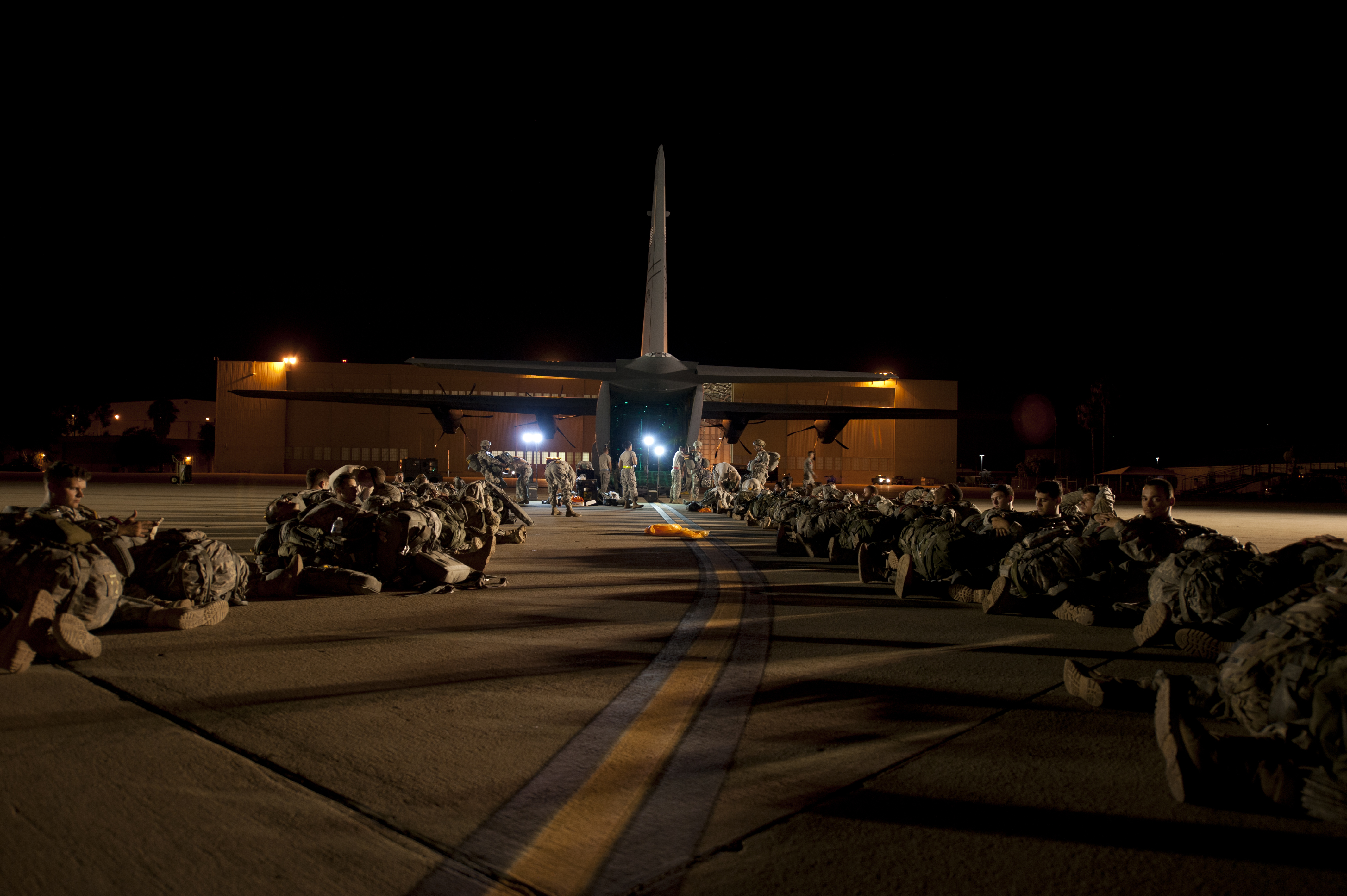 Troops from the 2nd Brigade Combat Team, 82nd Airborne Division, prepare to board a C-130J, Aug. 6, 2015, at March Air Reserve Base, Calif. The 82nd AD deployed in support of Operation Dragon Spear, which includes a joint forcible entry operation to demonstrate the Army's ability to project decisive combat power with the help from the Air Force's Herculean Combat Airlift muscle. (U.S. Air Force photo by Senior Airman Scott Poe)