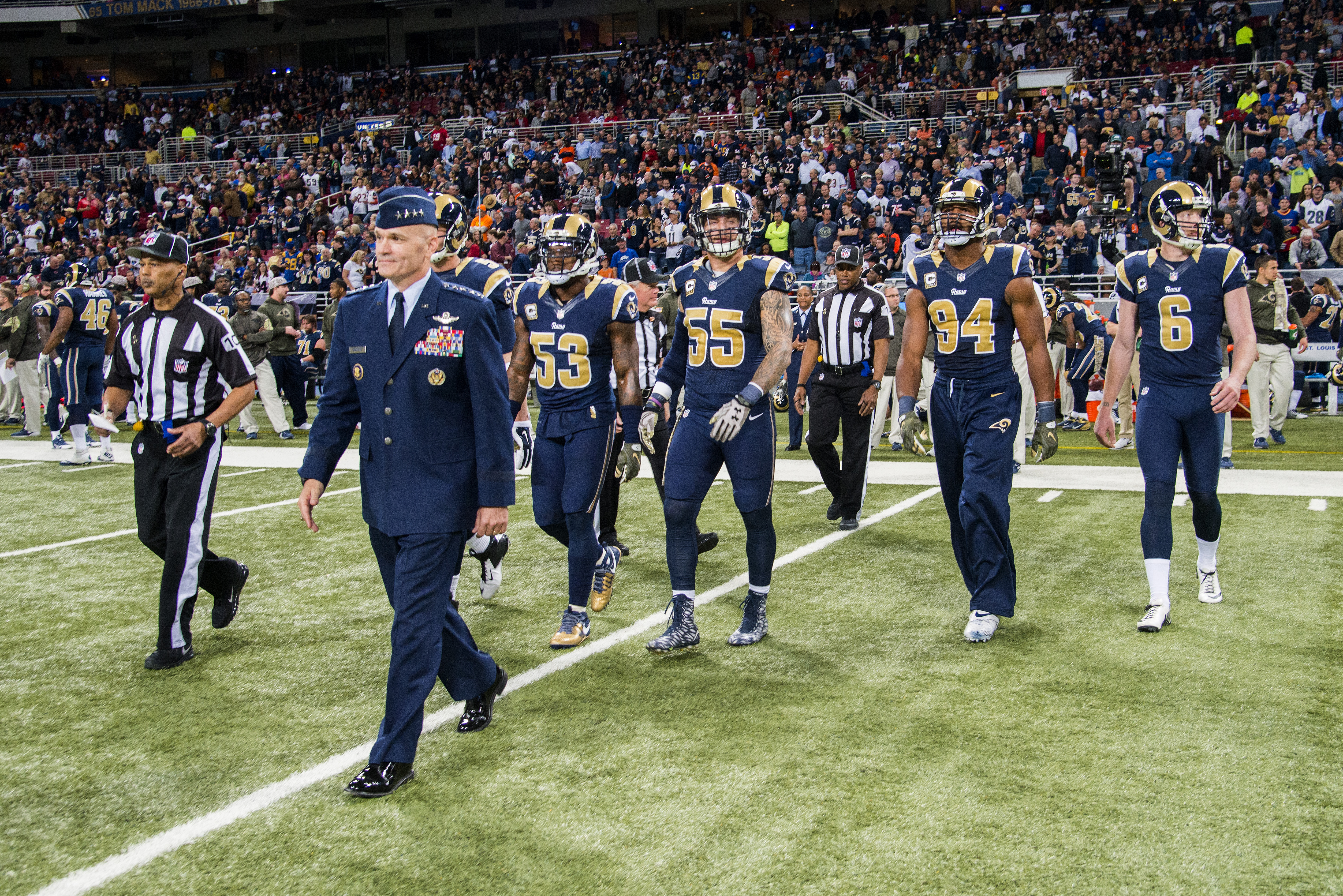 Gen. Carlton Everhart II, Air Mobility Command commander, walks out towards center field for the coin toss during the opening ceremony of the St. Louis Rams vs. Chicago Bears game Nov. 16, 2015 at the Edward Jones Dome in St. Louis, Missouri. Everhart served as an honorary team captain during the coin toss. (U.S. Air Force photo/ Senior Airman Tristin English)