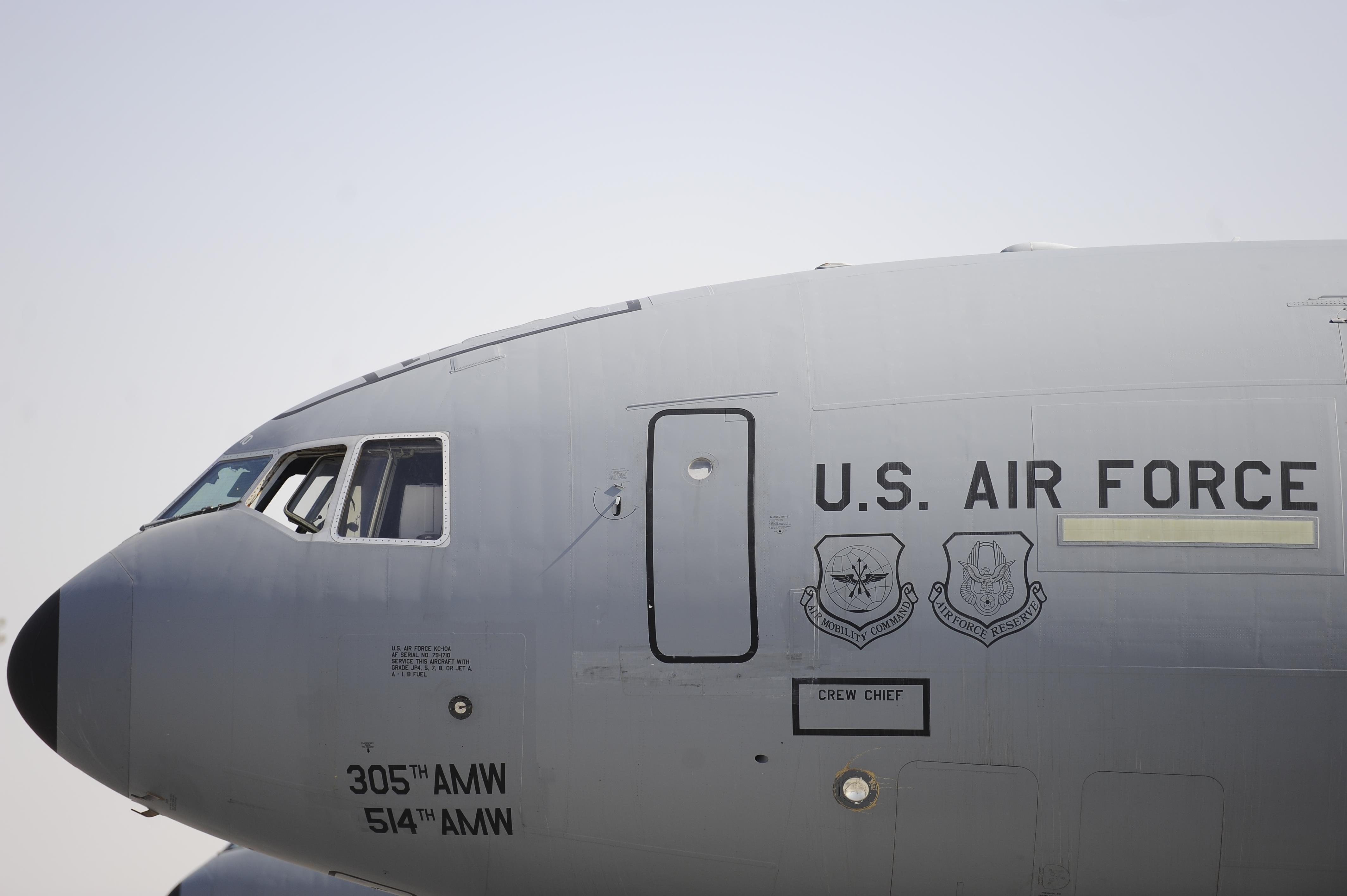 A KC-10 Extender parks on the 380th Air Expeditionary Wing’s flightine after a refueling mission, Oct. 27, 2017. The Extender can refuel a wide variety of U.S. and allied military aircraft within the same mission due to an advanced aerial refueling boom, a hose and drogue centerline refueling system. (U.S. Air Force photo by Tech. Sgt. Anthony Nelson Jr.)