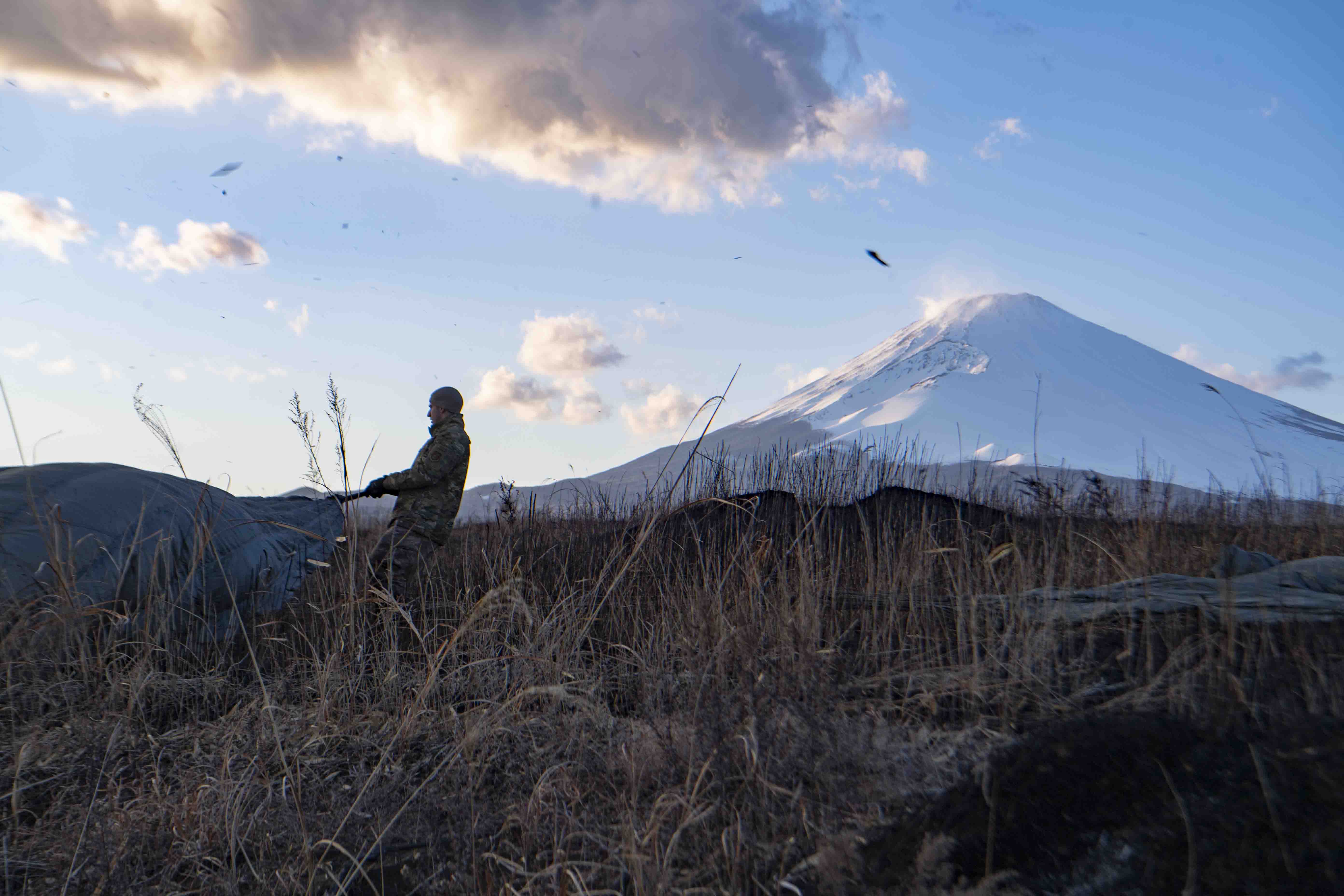 An Airman with the 374th Logistics Readiness Squadron pulls the canopy and suspension lines before folding and stowing the canopy inside the recovery bag at the Combined Arms Training Center, Camp Fuji, Japan, Feb. 10, 2020. After all of the bundles landed in the DZ, Airmen with the 374th LRS combat mobility flight gathered each bundle along with the parachutes to bring back to Yokota Air Base. (U.S. Air Force photo by Airman 1st Class Brieana E. Bolfing)