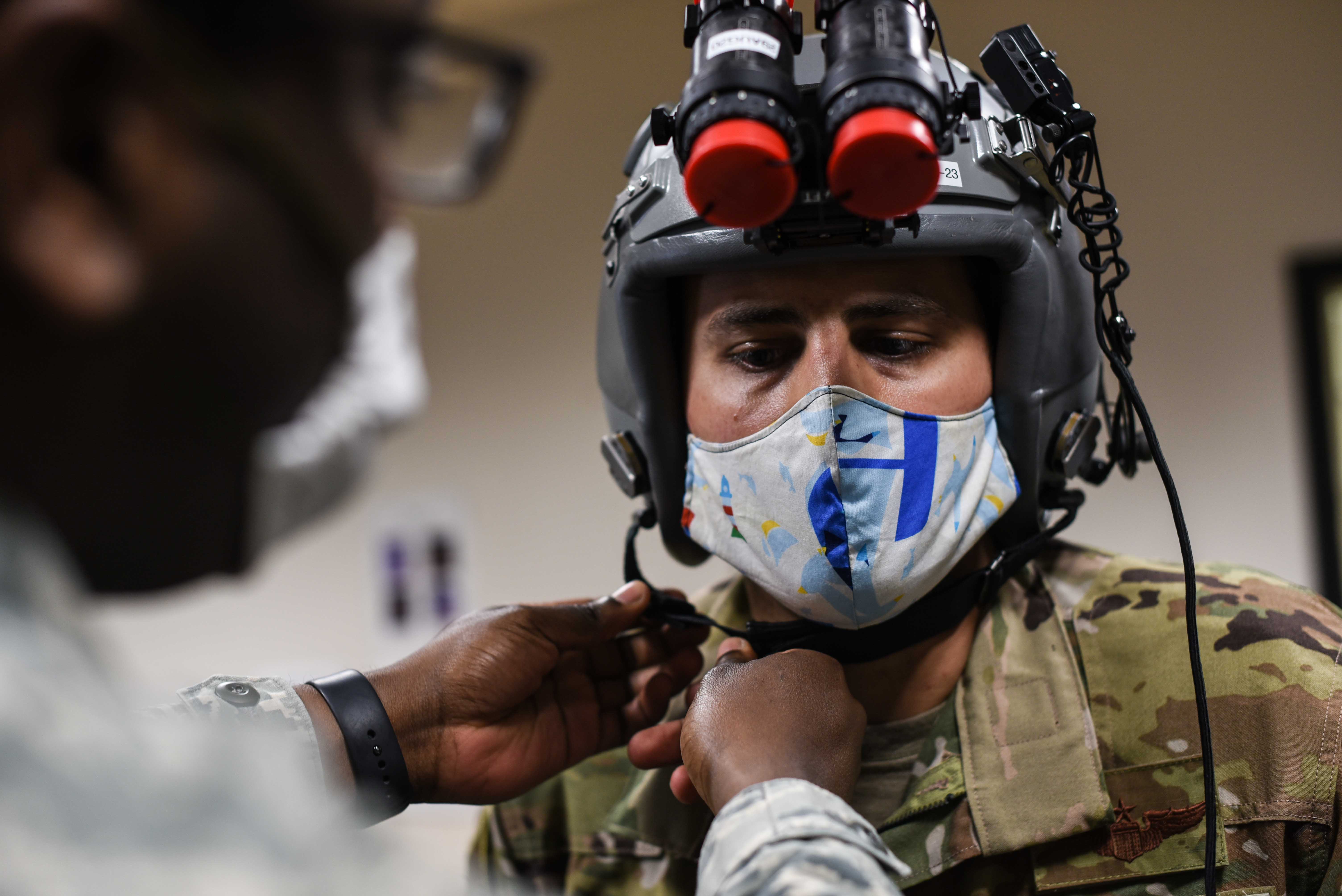 Maj. Tony Gorry, 344th Air Refueling Squadron and chief of group training, has his helmet fitted by Airman 1st Class Trezvon Miers, 22nd Operations Support Squadron aircrew flight equipment journeyman, April 21, 2020, at McConnell Air Force Base, Kansas. The crew prepared to execute the Air Force’s first night vision operational training mission on the KC-46A Pegasus. (U.S. Air Force photo by Senior Airman Alexi Bosarge)