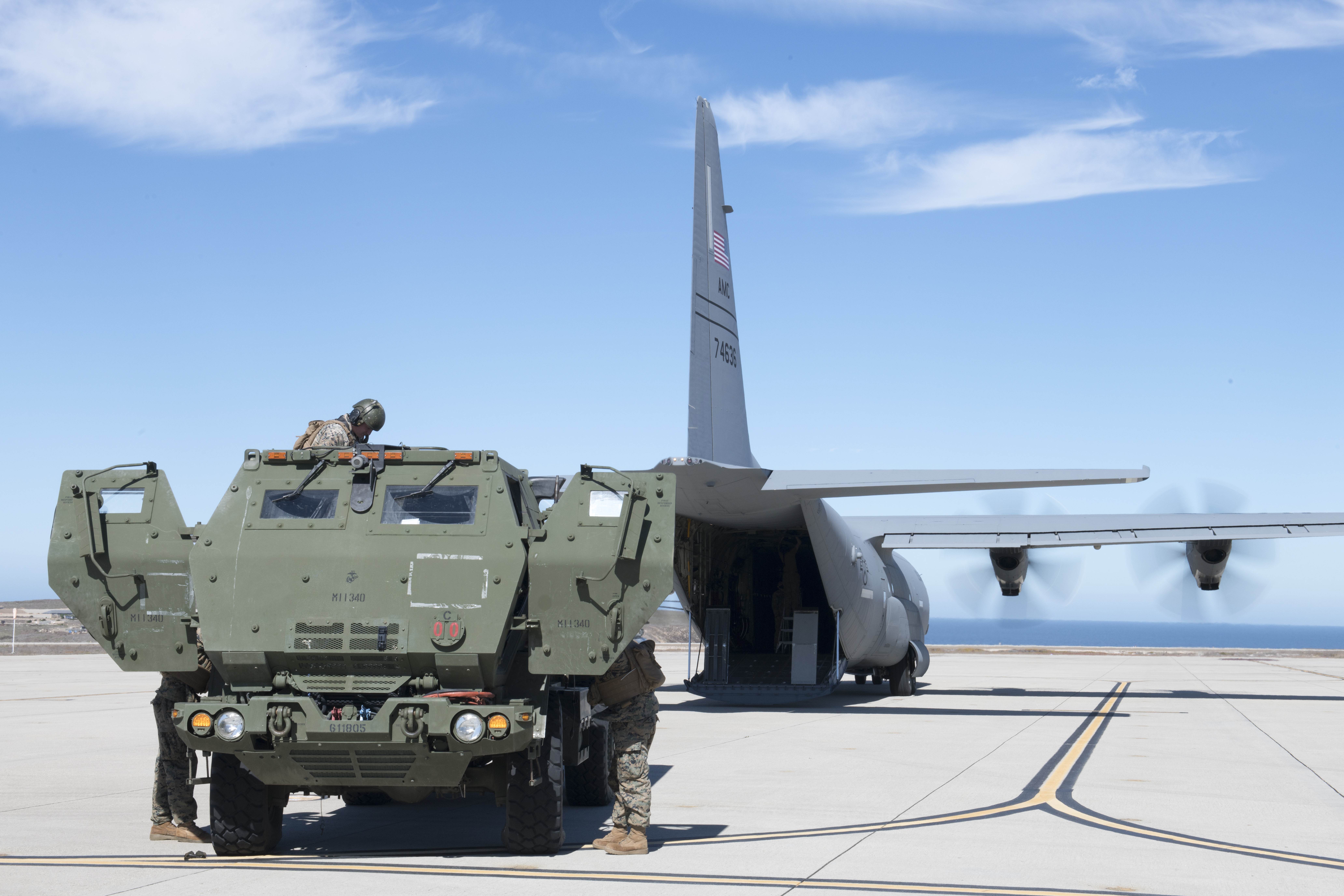 Marines from the 1st Marine Division out of Camp Pendleton, California conduct an inspection of a High Mobility Artillery Rocket System (HIMARS) after off-loading it from a C-130J Super Hercules before training at Naval Auxiliary Landing Field San Clemente off the coast of California, Feb. 19, 2021. The C-130Js provided agile combat airlift throughout the exercise, positioning, de-positioning, and conducting training with the 5/11 Marines out of Camp Pendleton, California, executing two lifts of High Mobility Artillery Rocket Systems (HIMARS) for simulated fires. (U.S. Air Force photo by Staff Sgt. Jeremy McGuffin)